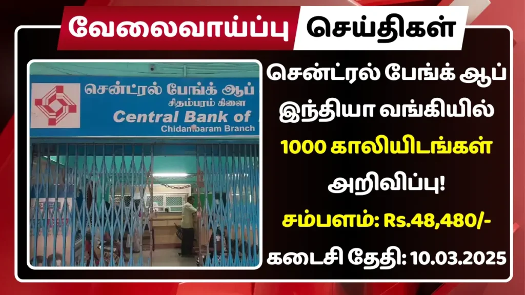 சென்ட்ரல் பேங்க் ஆப் இந்தியா வங்கியில் காலியாக உள்ள 1000 Credit Officer பணியிடங்களை நிரப்ப தகுதியான நபர்களிடமிருந்து விண்ணப்பங்கள் வரவேற்கப்படுகின்றன.
