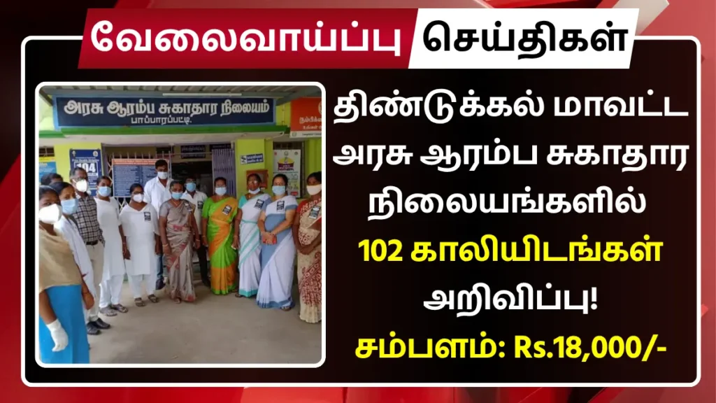 திண்டுக்கல் மாவட்டத்தில் செயல்படும் அரசு மருத்துவக் கல்லூரி மருத்துவமனை, நகர்ப்புற ஆரம்ப சுகாதார நிலையங்கள் மற்றும் அரசு ஆரம்ப சுகாதார நிலையங்களில் காலியாக உள்ள கீழ்கண்ட பணியிடங்களை நிரப்ப தகுதி வாய்ந்த நபர்களிடமிருந்து விண்ணப்பங்கள் வரவேற்கப்படுகின்றன.