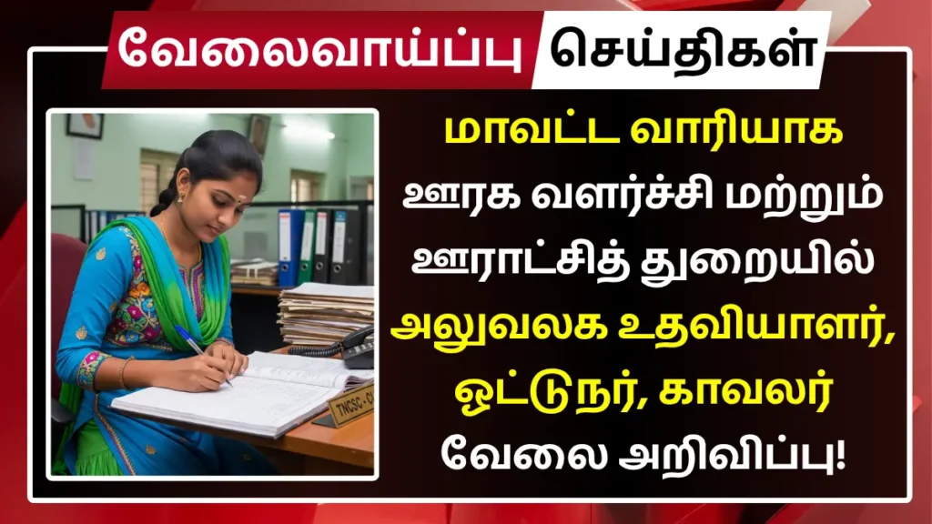 தமிழ்நாடு அரசு ஊரக வளர்ச்சி மற்றும் ஊராட்சித் துறையில் காலியாக உள்ள அலுவலக உதவியாளர், ஈப்பு ஓட்டுநர் மற்றும் இரவு காவலர் பணியிடங்களை நிரப்ப தகுதியான நபர்களிடமிருந்து விண்ணப்பங்கள் வரவேற்கப்படுகின்றன.