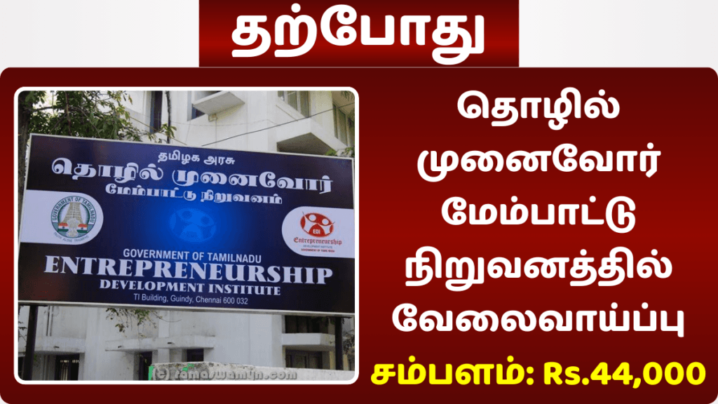 இந்திய தொழில் முனைவோர் மேம்பாட்டு நிறுவனத்தில் காலியாக உள்ள Project Officers பணியிடங்களை நிரப்ப மத்திய அரசு அறிவிப்பு வெளியிட்டுள்ளது. இதற்கான கல்வி தகுதி, சம்பளம், காலியிடங்கள் எண்ணிக்கை, விண்ணப்பிக்கும் முறை அனைத்தும் கீழே கொடுக்கப்பட்டுள்ளது.