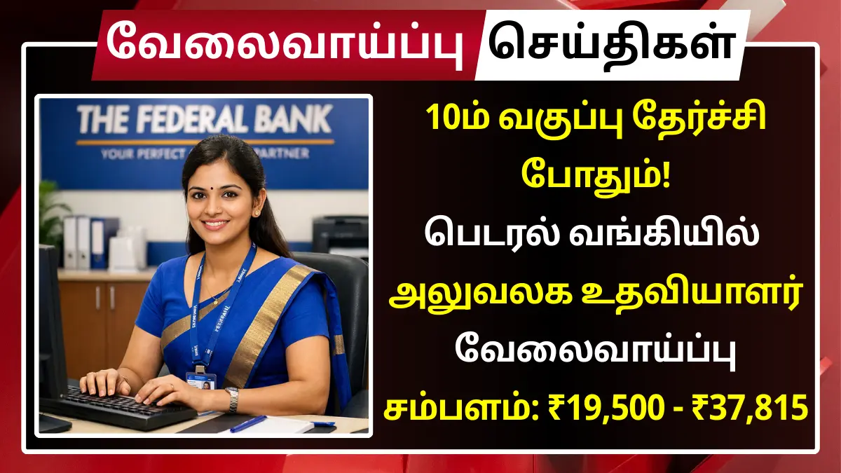 பெடரல் வங்கியில் காலியாக உள்ள அலுவலக உதவியாளர் (Office Assistant) பணியிடங்களுக்கு தகுதியான நபர்களிடமிருந்து விண்ணப்பங்கள் வரவேற்கப்படுகின்றன. விரிவான விவரம் கீழே கொடுக்கப்பட்டுள்ளது.