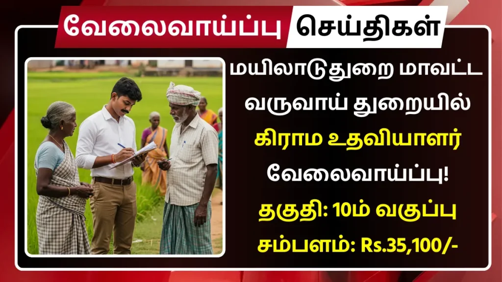 மயிலாடுதுறை மாவட்டம் வருவாய் அலகில் காலியாக உள்ள கிராம உதவியாளர் பணியிடங்களை நிரப்ப தகுதியான நபர்களிடமிருந்து விண்ணப்பங்கள் வரவேற்கப்படுகின்றன.