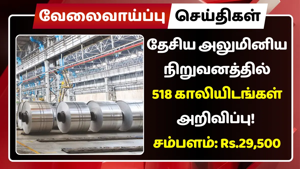 தேசிய அலுமினிய நிறுவனத்தில் காலியாக உள்ள 518 Non Executive பணியிடங்களை நிரப்ப தகுதியான நபர்களிடமிருந்து விண்ணப்பங்கள் வரவேற்கப்படுகின்றன.