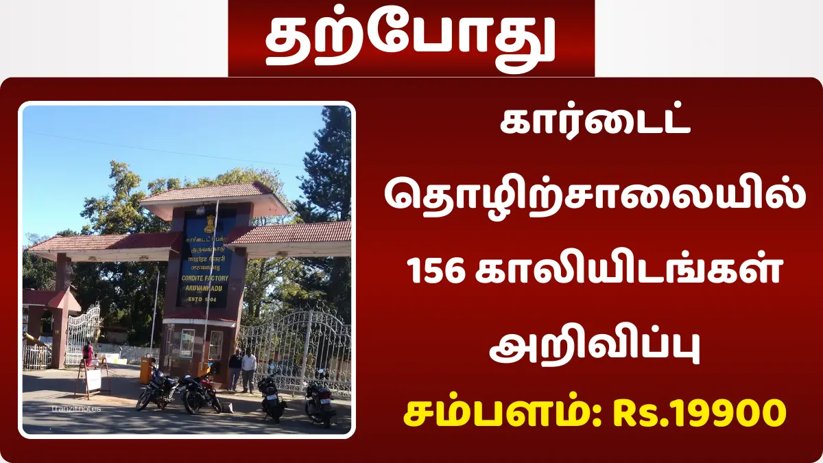 தமிழ்நாட்டில் உள்ள நீலகிரி மாவட்டம் அருவங்காட்டில் மத்திய அரசின் கார்டைட் தொழிற்சாலை செயல்பட்டு வருகிறது. இந்த தொழிற்சாலையில் காலியாக உள்ள 156 CPW Personnel பணியிடங்களை நிரப்ப தகுதியான நபர்களிடமிருந்து விண்ணப்பங்கள் வரவேற்கப்படுகின்றன. தகுதியான நபர்கள் தபால் மூலம் விண்ணப்பிக்கவும்.