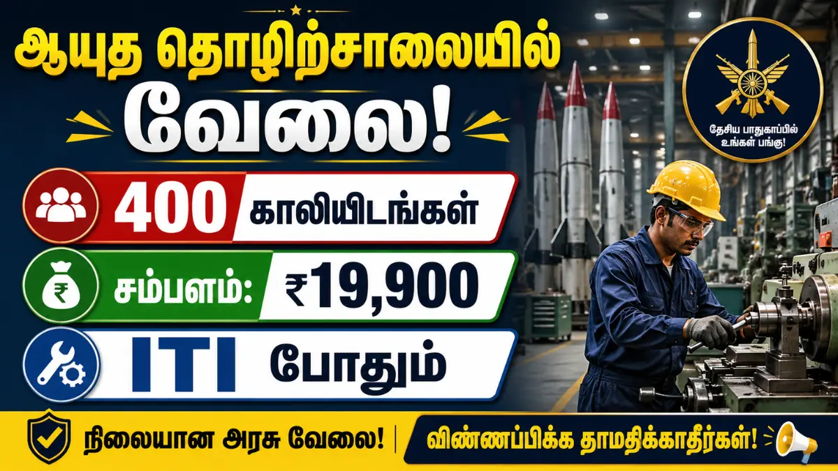 மத்திய அரசு நிறுவனமான Ordnance Factory Chanda (மகாராஷ்டிரா) நிறுவனத்தில் DBW (Danger Building Worker) பதவிக்கு மொத்தம் 400 காலியிடங்களுடன் புதிய வேலைவாய்ப்பு அறிவிப்பு வெளியிடப்பட்டுள்ளது. மாத சம்பளம் ரூ.19,900 வழங்கப்படுகின்றது. NCVT (NAC) சான்றிதழ் பெற்ற ITI தேர்ச்சி பெற்றவர்கள் விண்ணப்பிக்கலாம். விண்ணப்பங்கள் 18.04.2026 முதல் 30.04.2026 வரை பெறப்படும். Merit List மற்றும் Trade/Practical Test மூலம் தேர்வு நடைபெறும்.