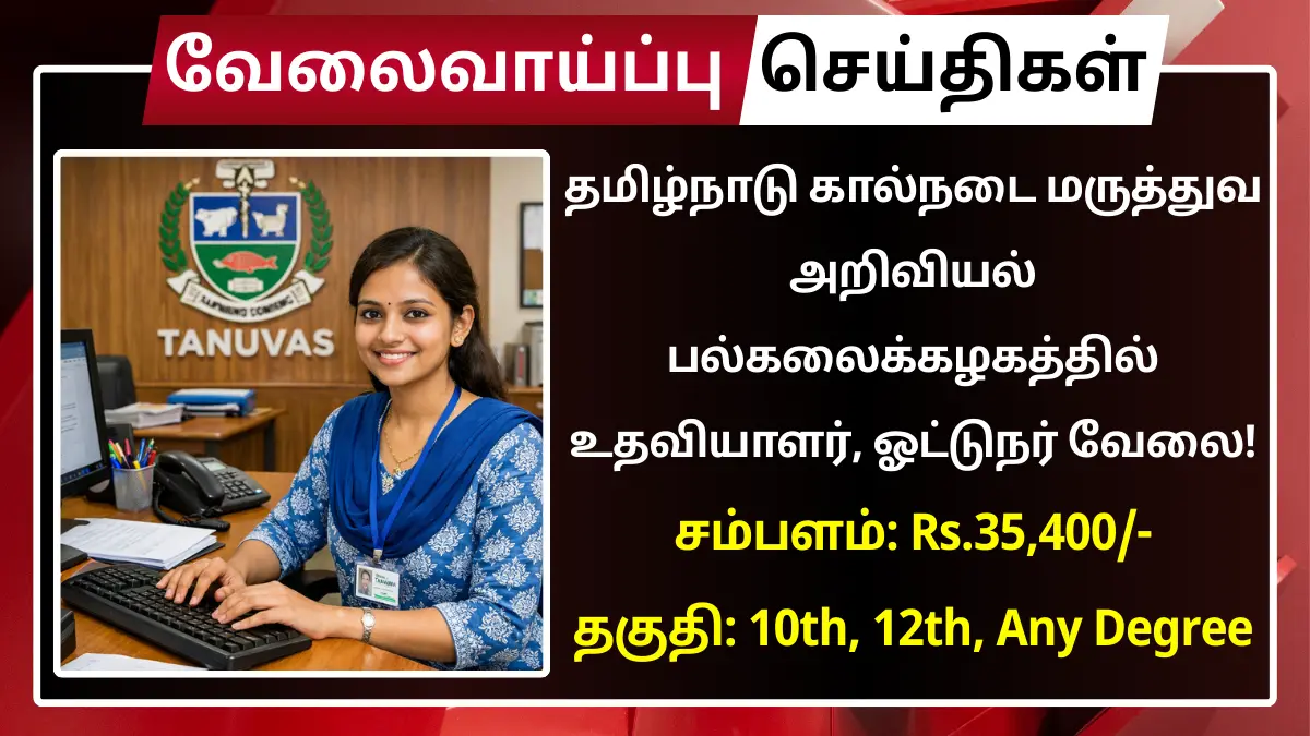 தமிழ்நாடு கால்நடை மருத்துவ அறிவியல் பல்கலைக்கழகத்தில் காலியாக உள்ள கீழ்கண்ட பணியிடங்களை நிரப்ப தகுதியான நபர்களிடமிருந்து விண்ணப்பங்கள் வரவேற்கப்படுகின்றன.