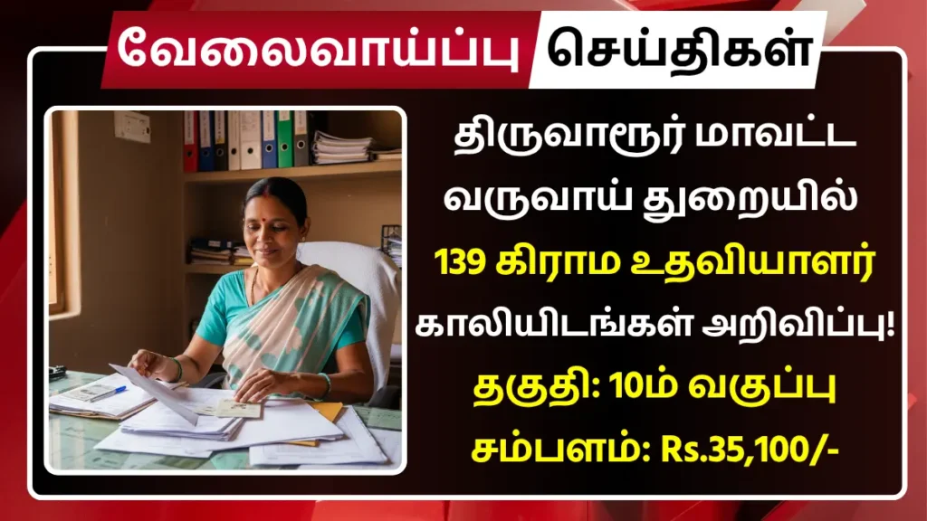 திருவாரூர் மாவட்டம் வருவாய் அலகில் காலியாக உள்ள கிராம உதவியாளர் பணியிடங்களை நிரப்ப தகுதியான நபர்களிடமிருந்து விண்ணப்பங்கள் வரவேற்கப்படுகின்றன.