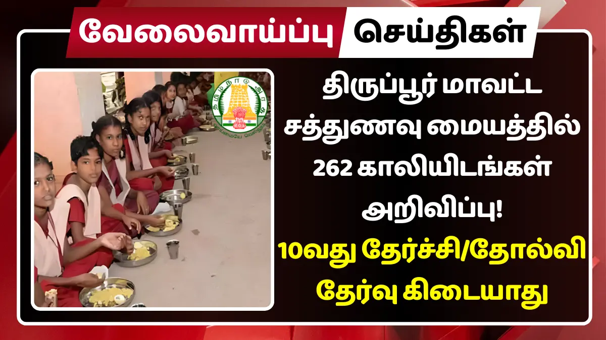 சத்துணவு திட்டத்தின் கீழ் திருப்பூர் மாவட்டத்தில் பள்ளிகளில் செயல்படும் சத்துணவு மையங்களில் காலியாக உள்ள 262 சமையல் உதவியாளர் பணியிடங்களை நேரடி நியமனம் மூலம் நிரப்ப தமிழ்நாடு அரசு அறிவிப்பு வெளியிட்டுள்ளது.