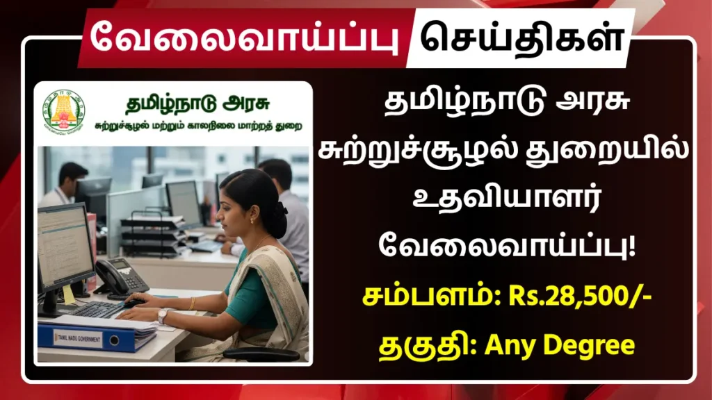 தமிழ்நாடு அரசு சுற்றுச்சூழல் மற்றும் காலநிலை மாற்றத் துறையில் காலியாக உள்ள கீழ்க்கண்ட பணியிடங்களை நிரப்ப தகுதியான நபர்களிடமிருந்து விண்ணப்பங்கள் வரவேற்கப்படுகின்றன.