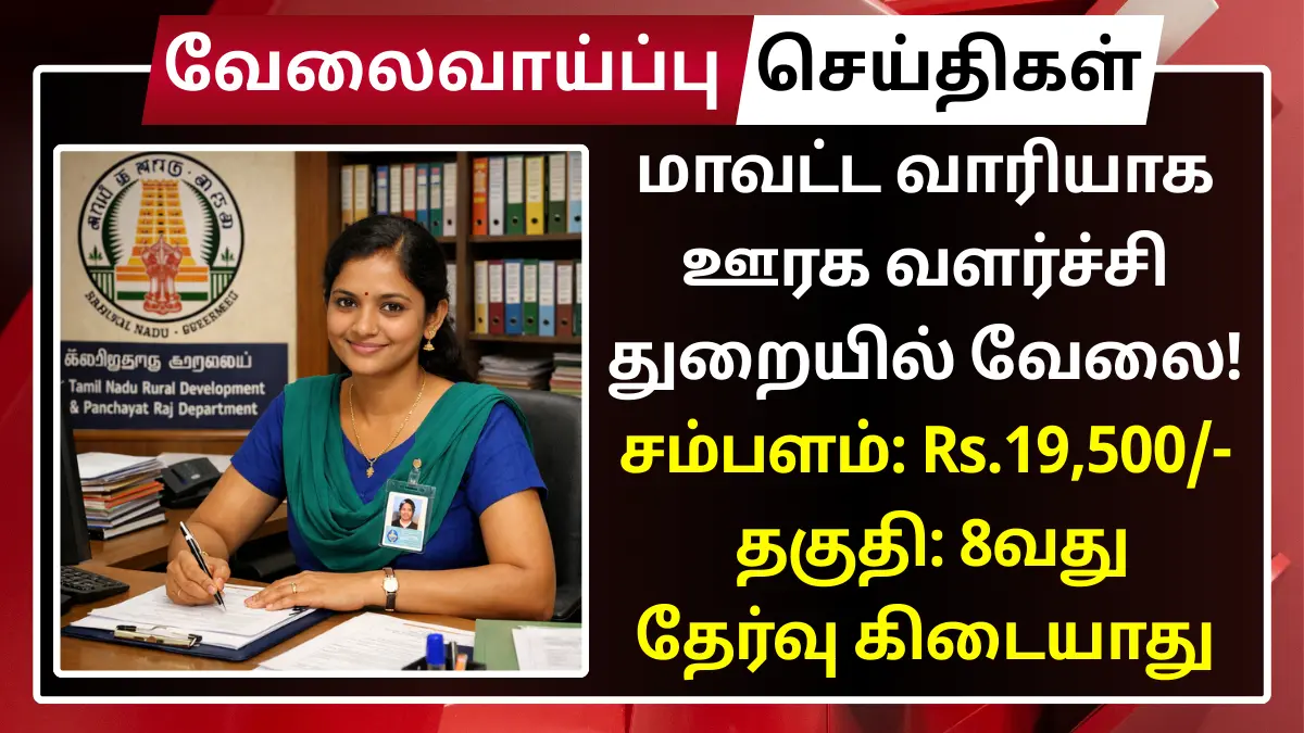 தமிழ்நாடு அரசு ஊரக வளர்ச்சி மற்றும் ஊராட்சித் துறையில் காலியாக உள்ள அலுவலக உதவியாளர், ஈப்பு ஓட்டுநர் மற்றும் இரவு காவலர் பணியிடங்களை நிரப்ப தகுதியான நபர்களிடமிருந்து விண்ணப்பங்கள் வரவேற்கப்படுகின்றன.