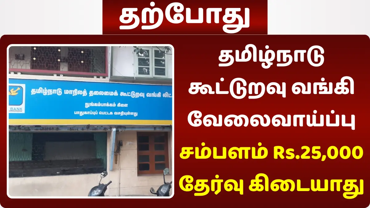 தமிழ்நாடு மாநில தலைமை கூட்டுறவு வங்கியில் காலியாக உள்ள Cooperative Intern பணியிடங்களை நிரப்ப தமிழ்நாடு அரசு அறிவிப்பு வெளியிட்டுள்ளது. இதற்கான கல்வி தகுதி, சம்பளம், காலியிடங்கள் எண்ணிக்கை, தேர்வு செய்யும் முறை அனைத்தும் கீழே கொடுக்கப்பட்டுள்ளது.