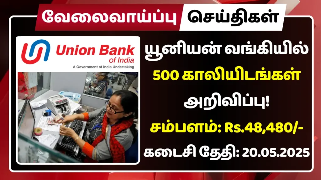 இந்திய யூனியன் வங்கியில் (Union Bank of India) காலியாக உள்ள 500 Assistant Manager பணியிடங்களை நிரப்ப தகுதியான நபர்களிடமிருந்து விண்ணப்பங்கள் வரவேற்கப்படுகின்றன.