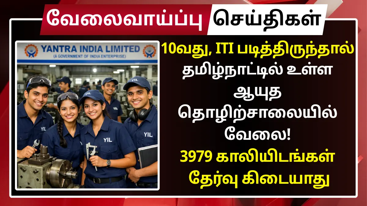 Yantra India Limited (YIL) காலியாக உள்ள 3979 Apprentices பணியிடங்களை நிரப்ப தகுதியான நபர்களிடமிருந்து விண்ணப்பங்கள் வரவேற்கப்படுகின்றன.
